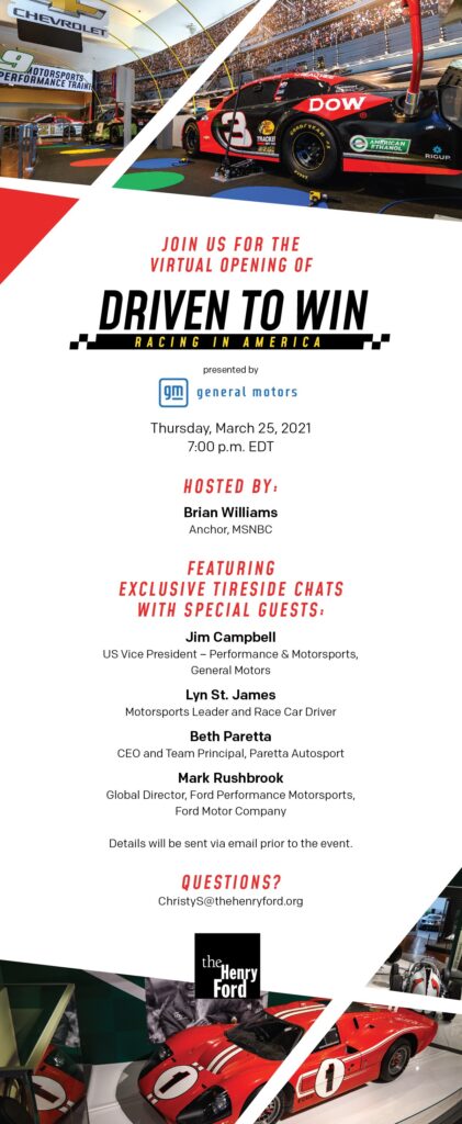 Join The Henry Ford for the virtual opening of Driven to Win: Racing in America presented by General Motors.